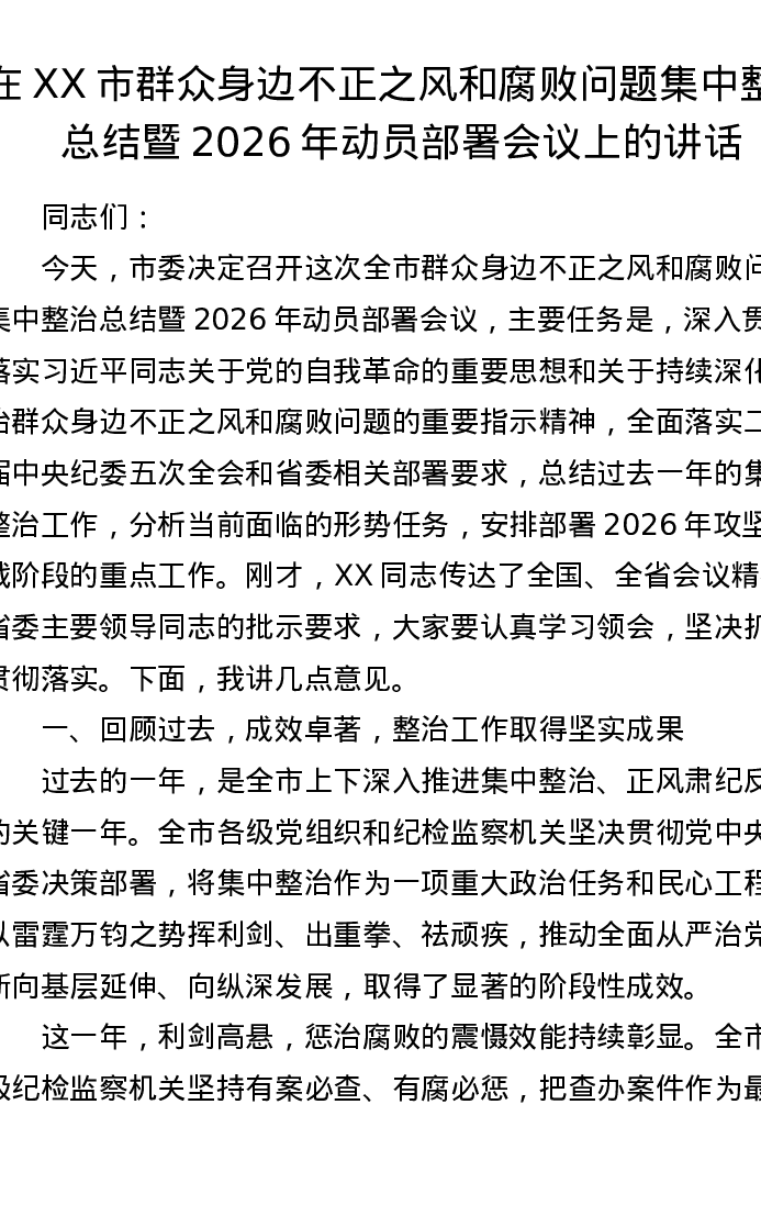 在XX市群众身边不正之风和腐败问题集中整治总结暨2026年动员部署会议上的讲话