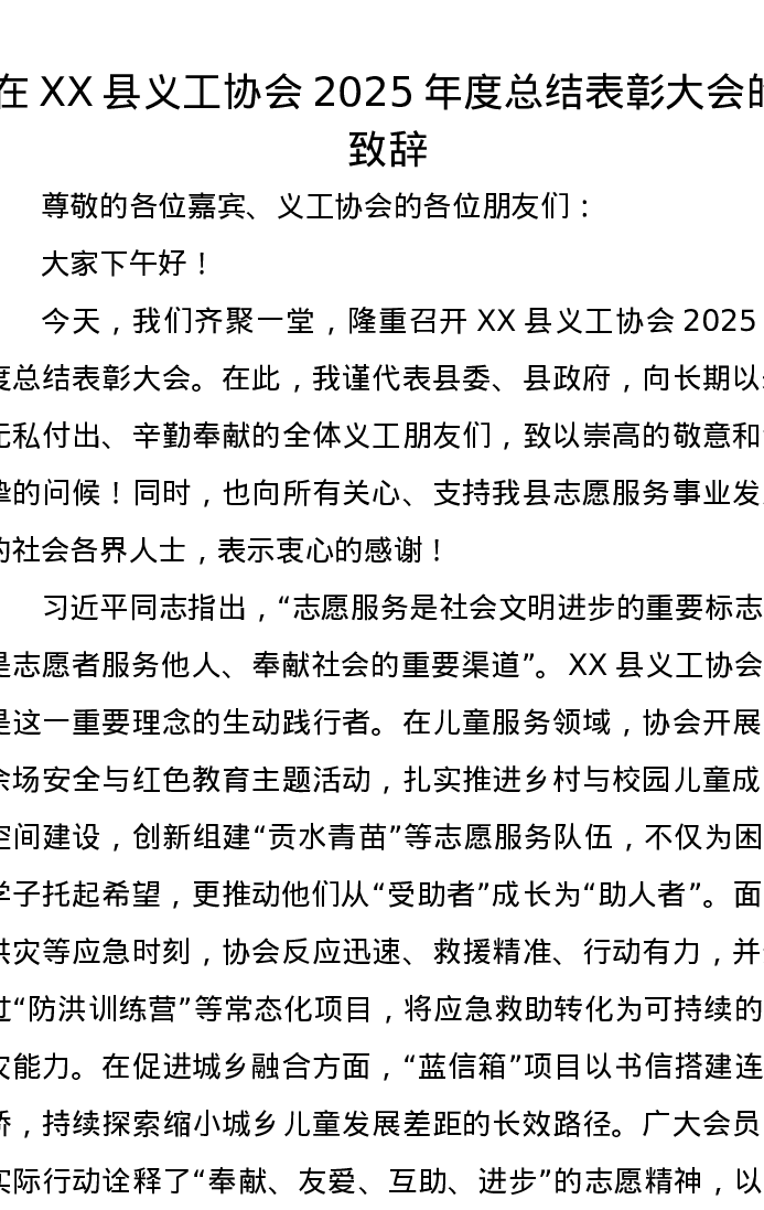 在XX县义工协会2025年度总结表彰大会的致辞