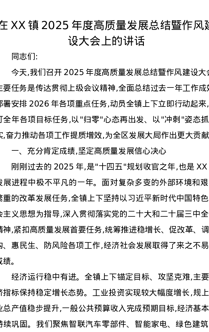 在XX镇2025年度高质量发展总结暨作风建设大会上的讲话