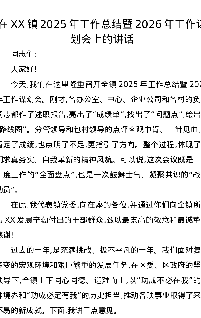 在XX镇2025年工作总结暨2026年工作谋划会上的讲话