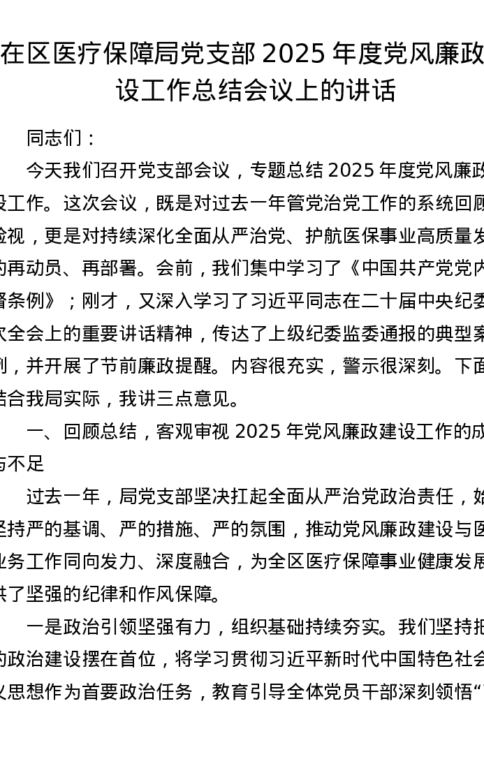在区医疗保障局党支部2025年度党风廉政建设工作总结会议上的讲话