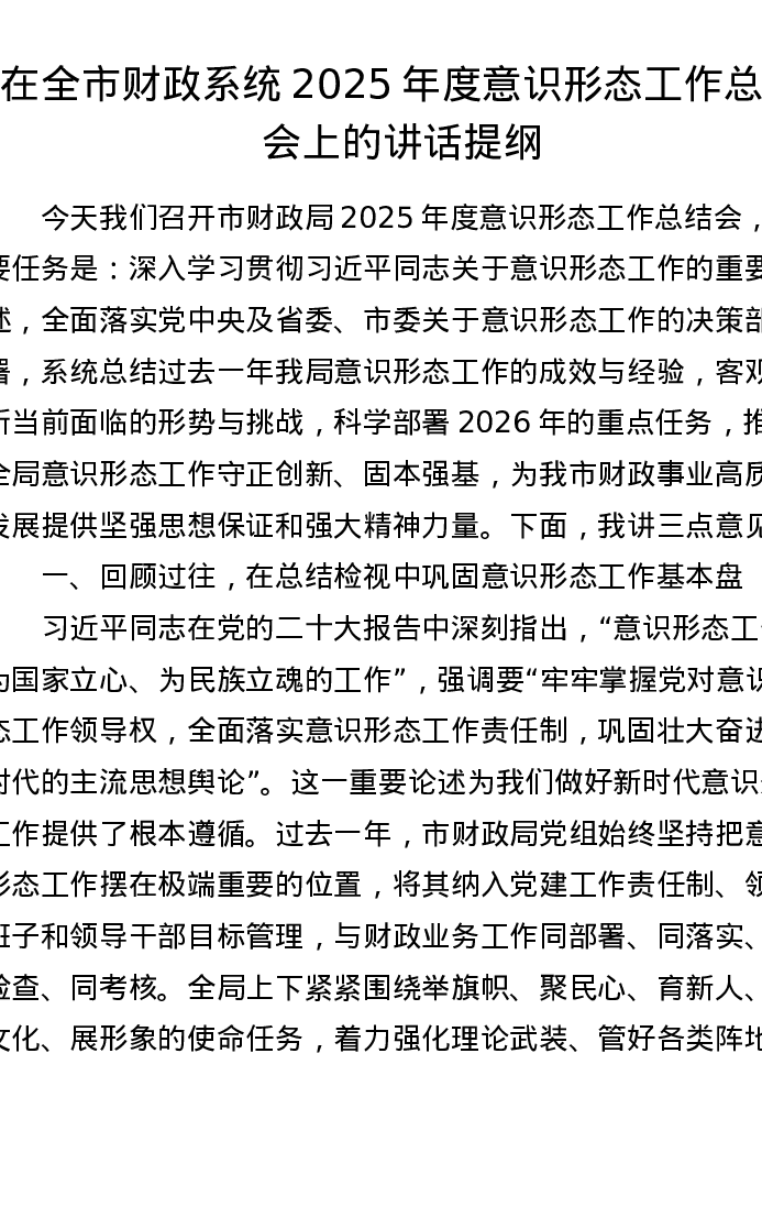 在全市财政系统2025年度意识形态工作总结会上的讲话提纲