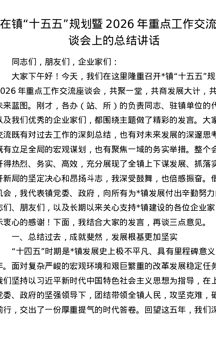 在镇十五五规划暨2026年重点工作交流座谈会上的总结讲话