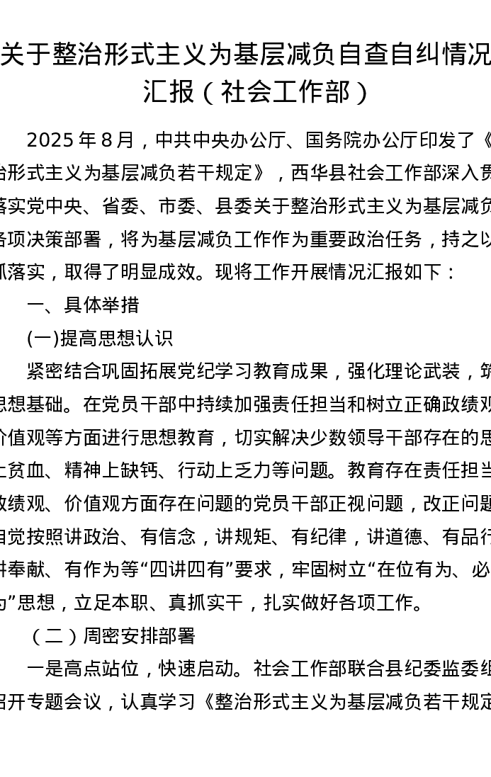 关于整治形式主义为基层减负自查自纠情况的汇报(社会工作部)