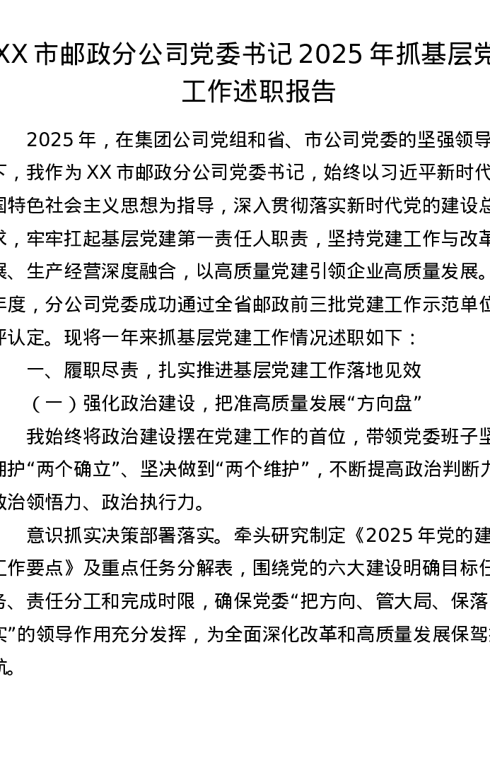 XX市邮政分公司党委书记2025年抓基层党建工作述职报告