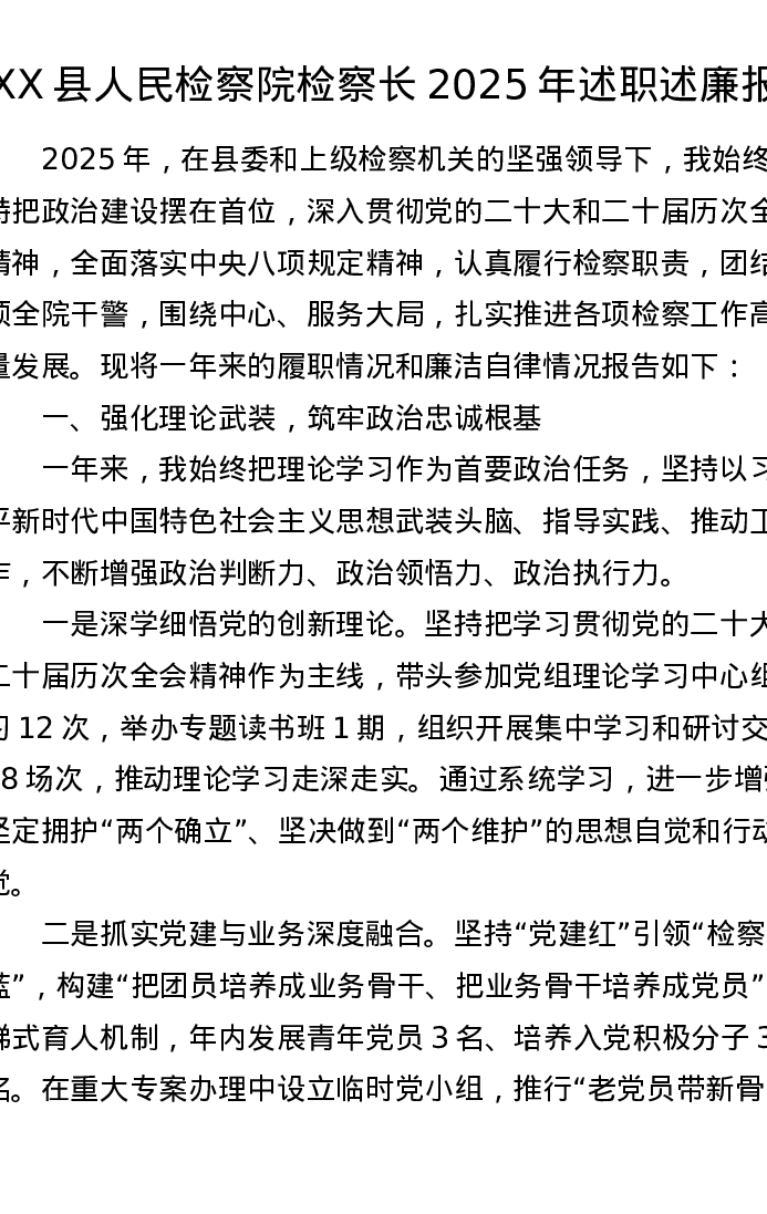 XX县人民检察院检察长2025年述职述廉报告