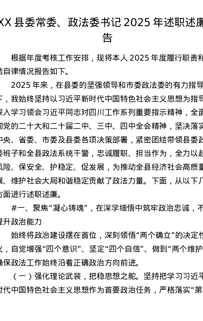 XX县委常委、政法委书记2025年述职述廉报告(5066字)