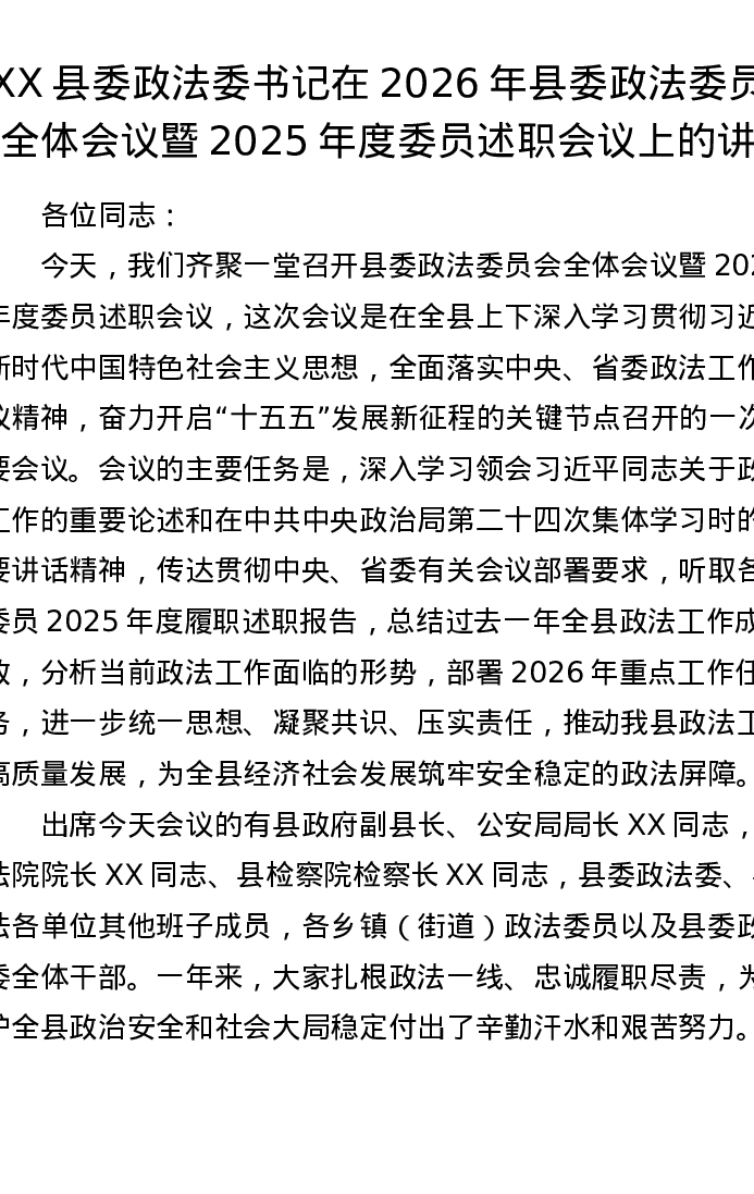 XX县委政法委书记在2026年县委政法委员会全体会议暨2025年度委员述职会议上的讲话(6624字)
