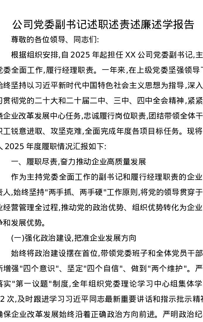 公司党委副书记述职述责述廉述学报告