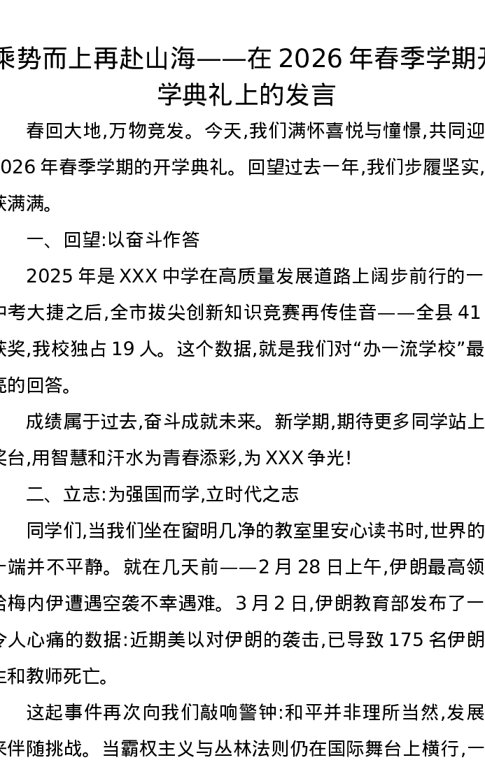 乘势而上再赴山海——在2026年春季学期开学典礼上的发言