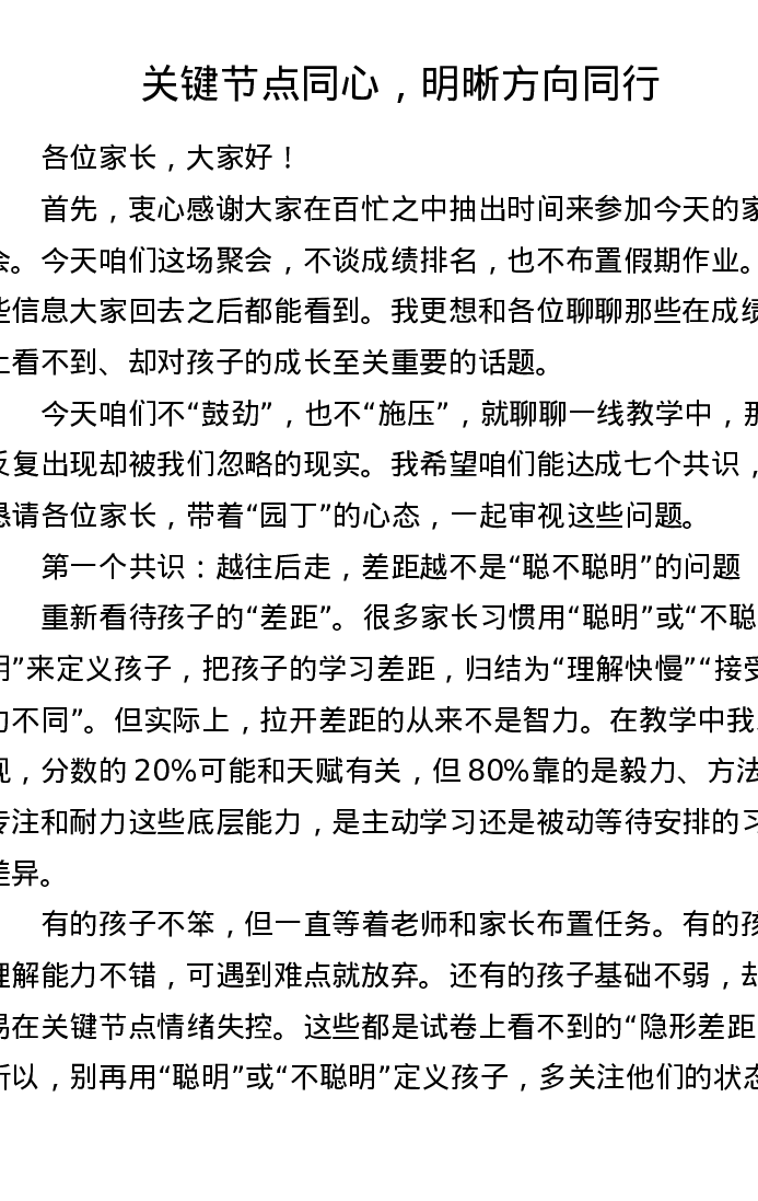 家长会【关键节点同心,明晰方向同行】发言稿2