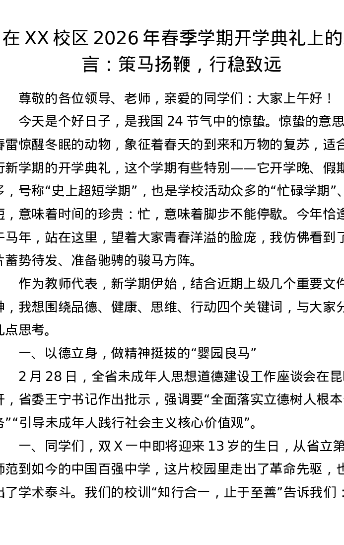 在XX 校区2026年春季学期开学典礼上的发言:策马扬鞭,行稳致远