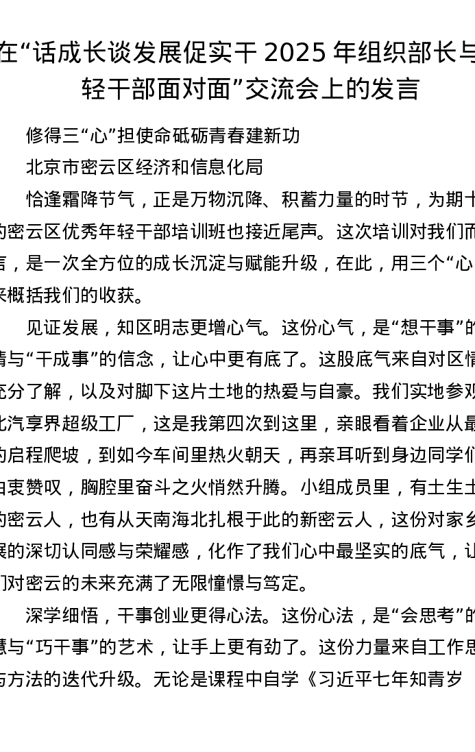 在话成长谈发展促实干2025年组织部长与年轻干部面对面交流会上的发言