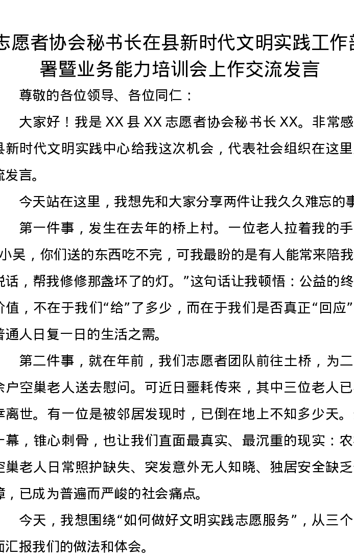 志愿者协会秘书长在县新时代文明实践工作部署暨业务能力培训会上作交流发言
