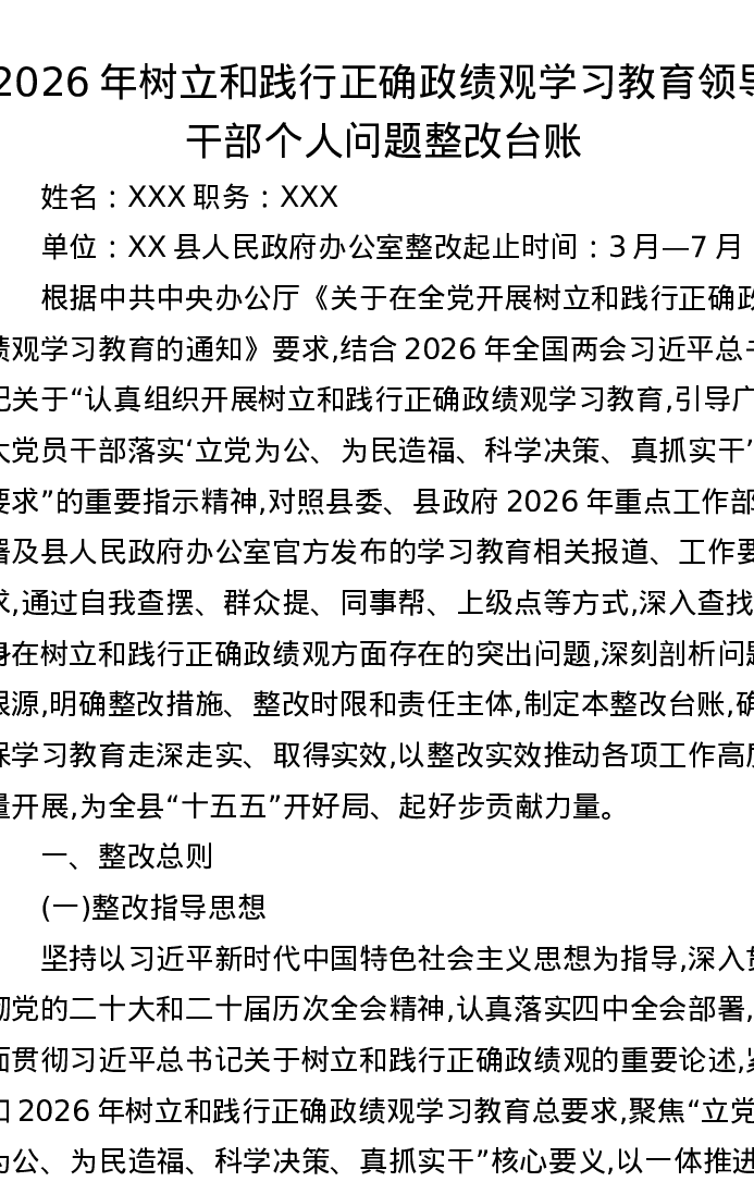 2026年树立和践行正确ZJG学习教育领导干部个人问题整改台账