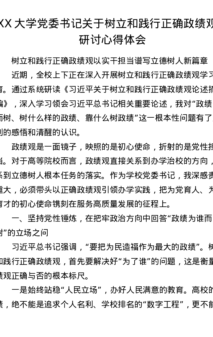 XX大学党委书记关于树立和践行正确ZJG的研讨心得体会