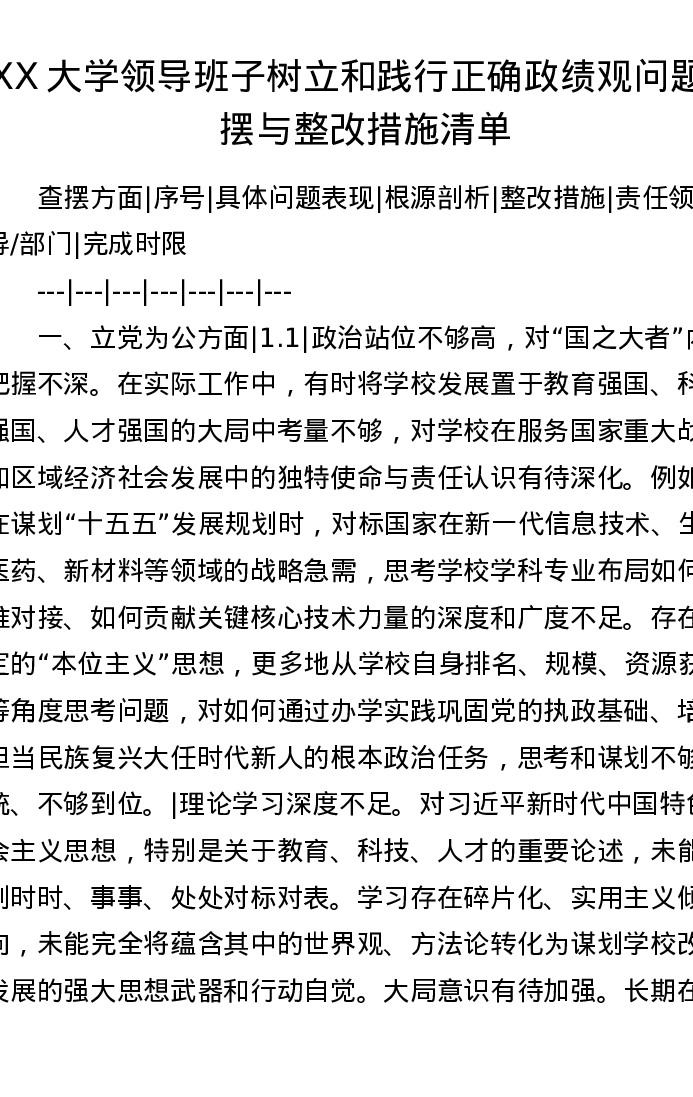 XX大学领导班子树立和践行正确ZJG问题查摆与整改措施清单