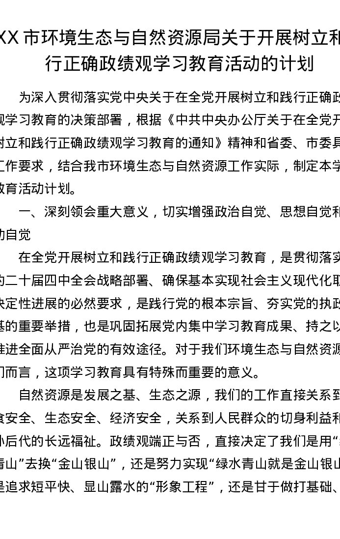 XX市环境生态与自然资源局关于开展树立和践行正确ZJG学习教育活动的计划