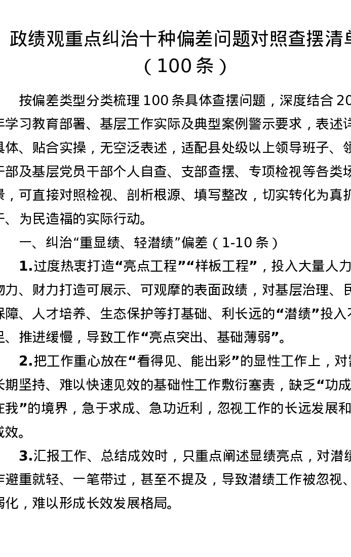ZJG重点纠治十种偏差问题对照查摆清单(100条)