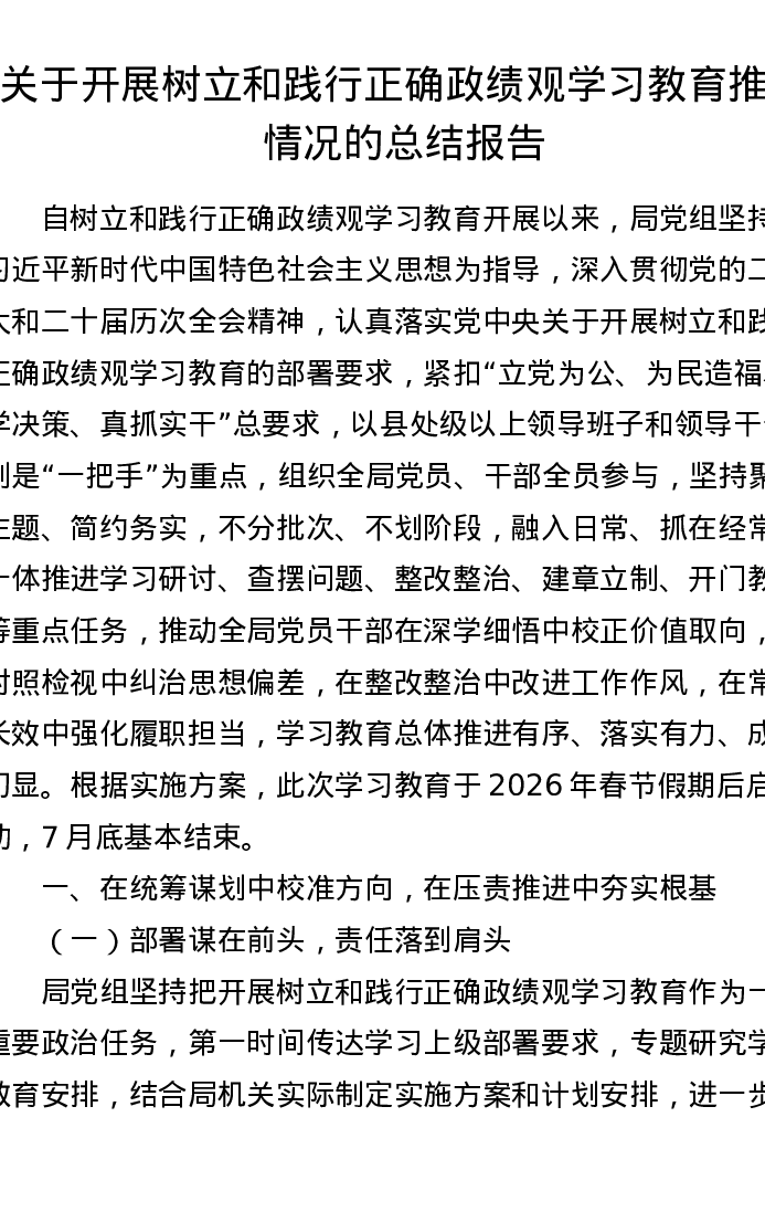 关于开展树立和践行正确ZJG学习教育推进情况的总结报告(局机关通用)