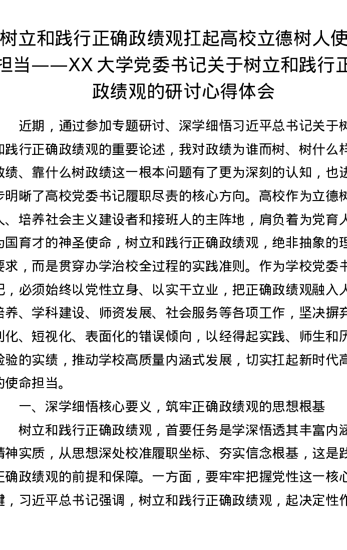 树立和践行正确ZJG 扛起高校立德树人使命担当——XX大学党委书记关于树立和践行正确ZJG的研讨心得体会