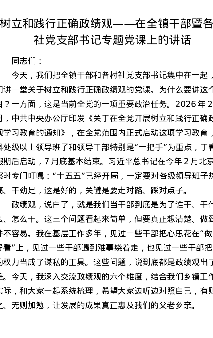 树立和践行正确ZJG——在全镇干部暨各村社党支部书记专题党课上的讲话
