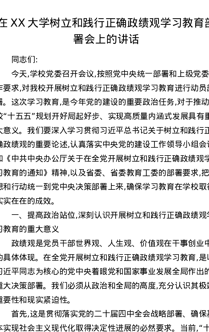 在XX大学树立和践行正确ZJG学习教育部署会上的讲话