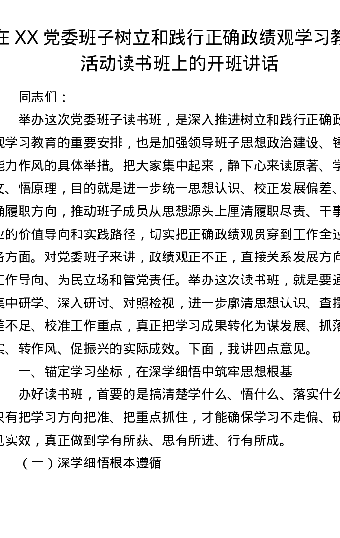 在XX党委班子树立和践行正确ZJG学习教育活动读书班上的开班讲话