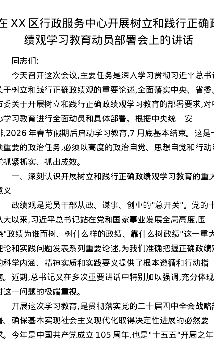 在XX区行政服务中心开展树立和践行正确ZJG学习教育动员部署会上的讲话