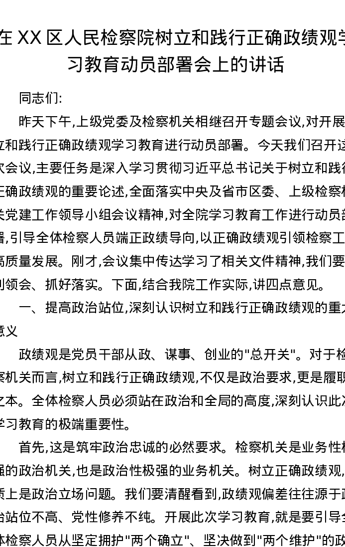 在XX区人民检察院树立和践行正确ZJG学习教育动员部署会上的讲话