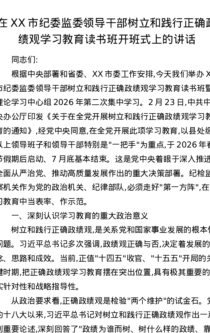 在XX市纪委监委领导干部树立和践行正确ZJG学习教育读书班开班式上的讲话