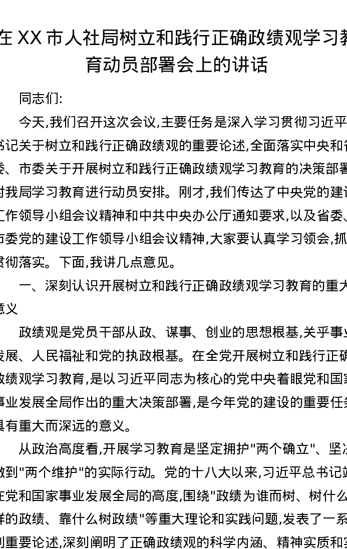 在XX市人社局树立和践行正确ZJG学习教育动员部署会上的讲话