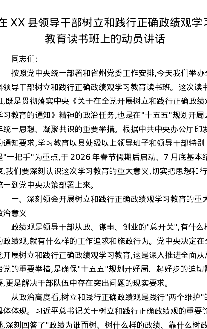 在XX县领导干部树立和践行正确ZJG学习教育读书班上的动员讲话