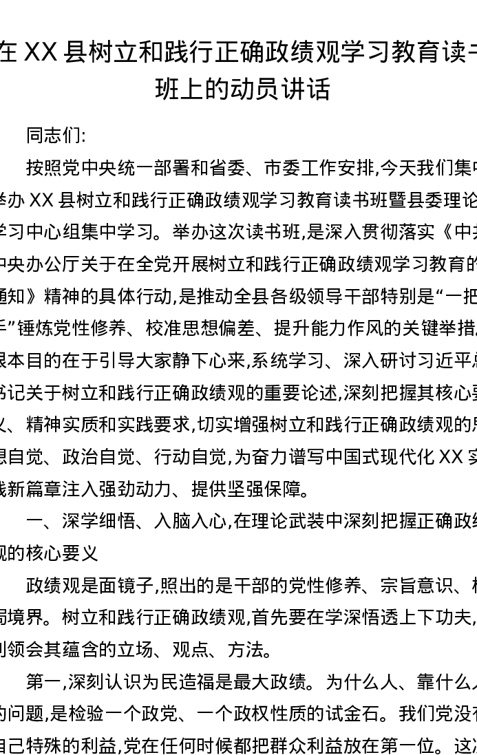 在XX县树立和践行正确ZJG学习教育读书班上的动员讲话