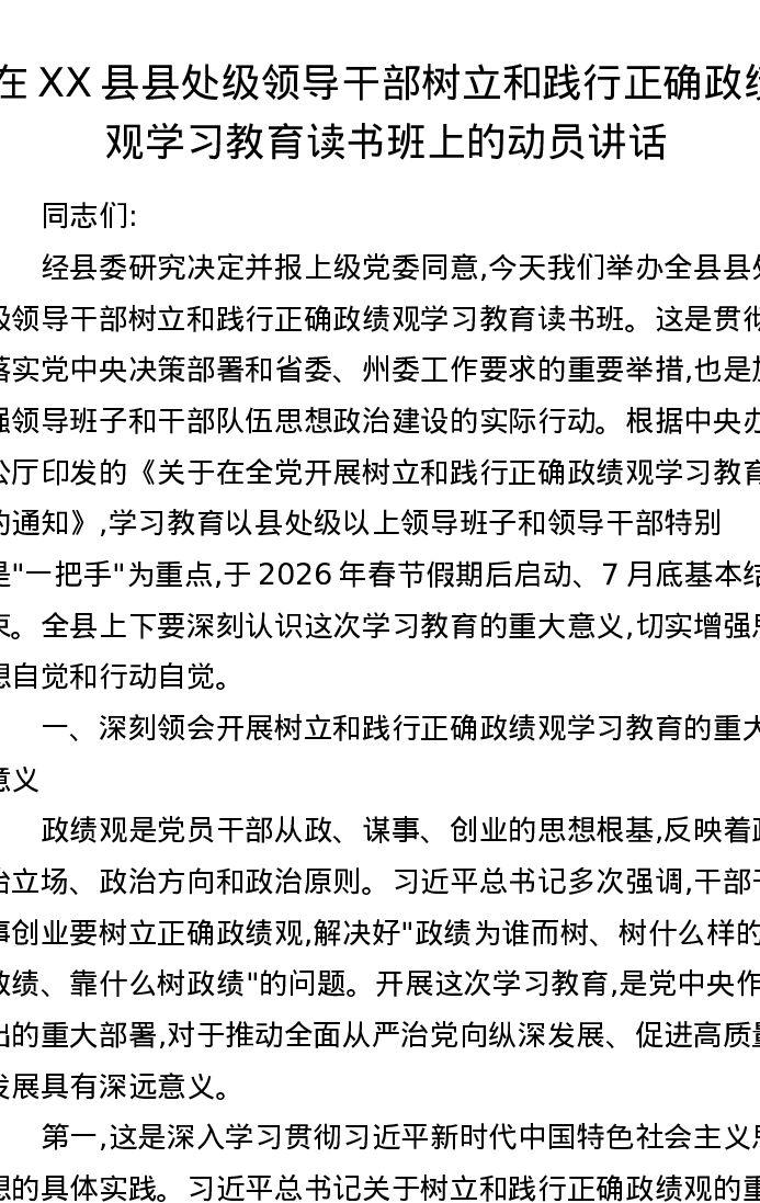 在XX县县处级领导干部树立和践行正确ZJG学习教育读书班上的动员讲话