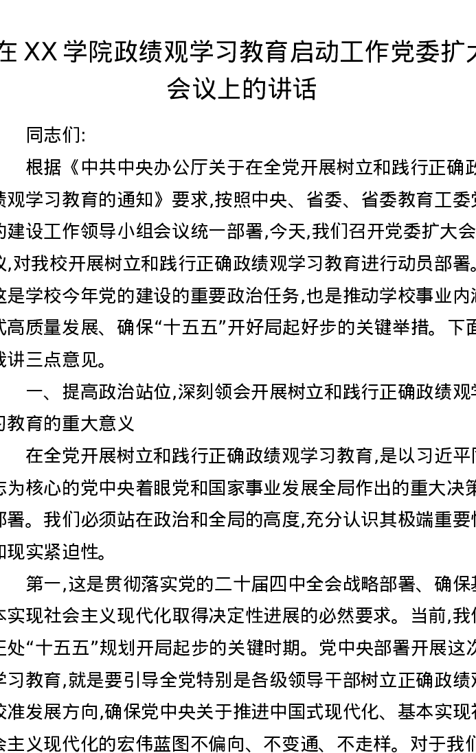 在XX学院ZJG学习教育启动工作党委扩大会议上的讲话