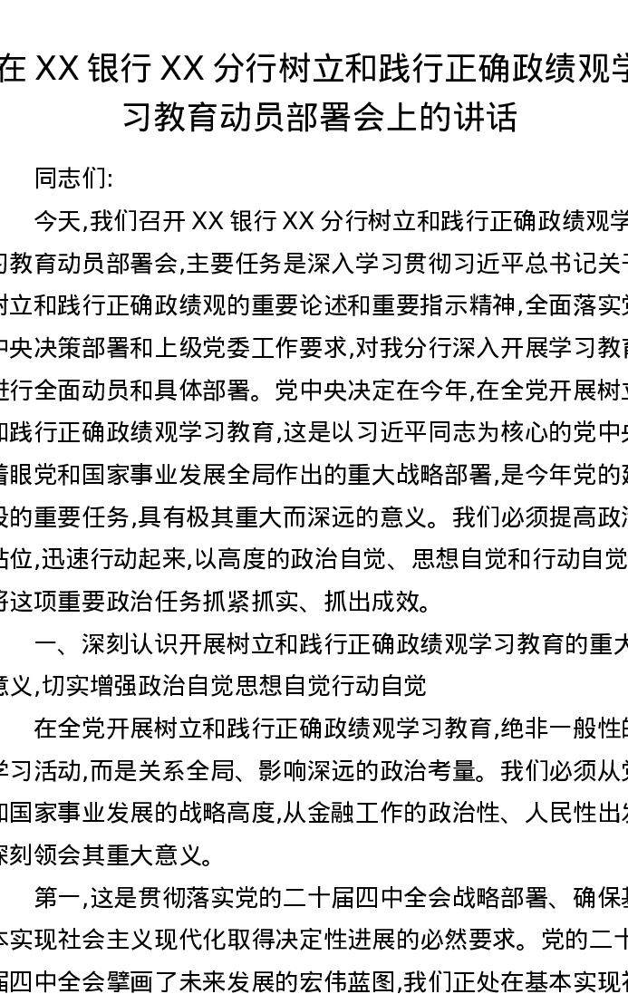 在XX银行XX分行树立和践行正确ZJG学习教育动员部署会上的讲话