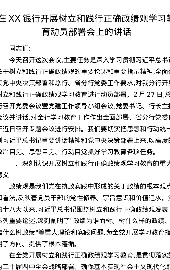 在XX银行开展树立和践行正确ZJG学习教育动员部署会上的讲话