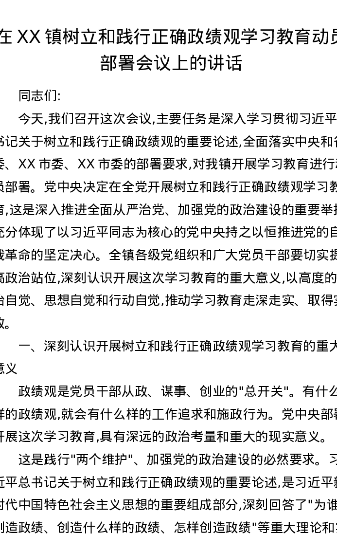 在XX镇树立和践行正确ZJG学习教育动员部署会议上的讲话