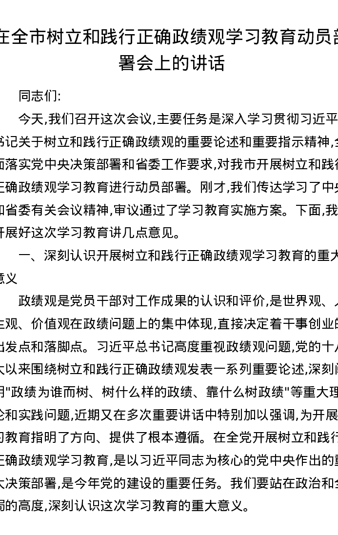 在全市树立和践行正确ZJG学习教育动员部署会上的讲话