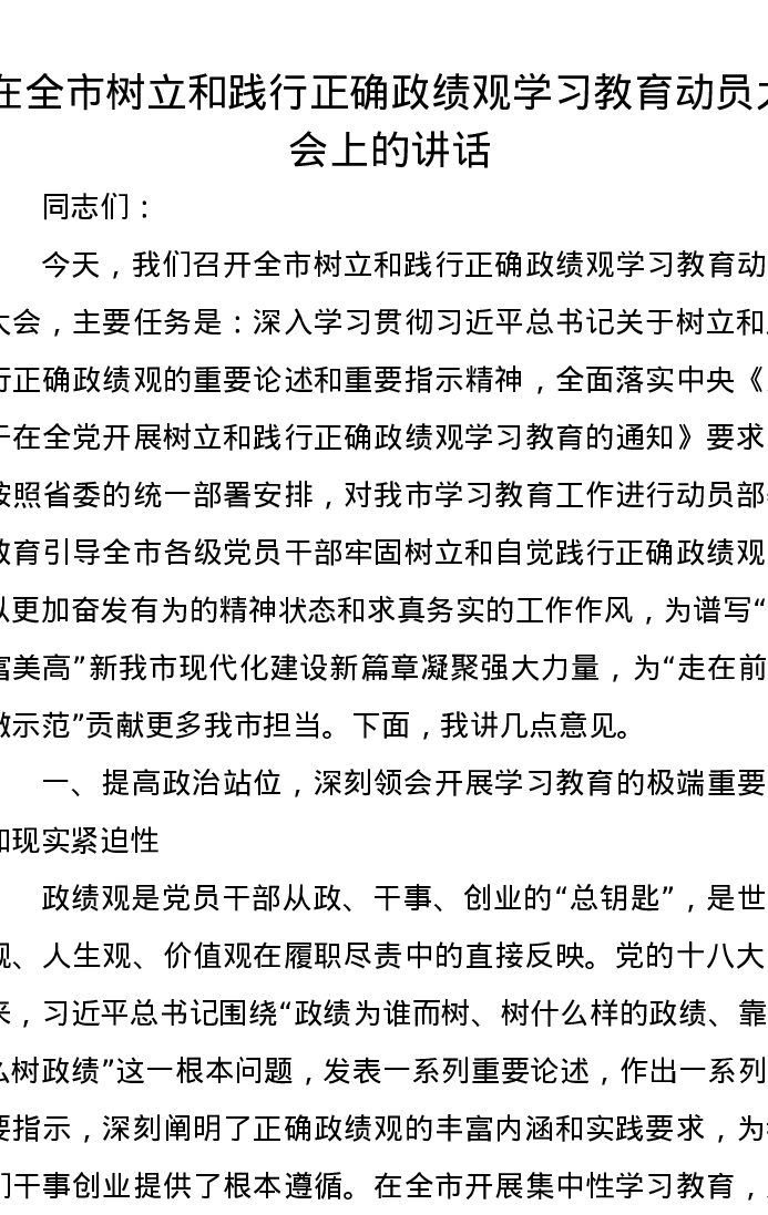 在全市树立和践行正确ZJG学习教育动员大会上的讲话