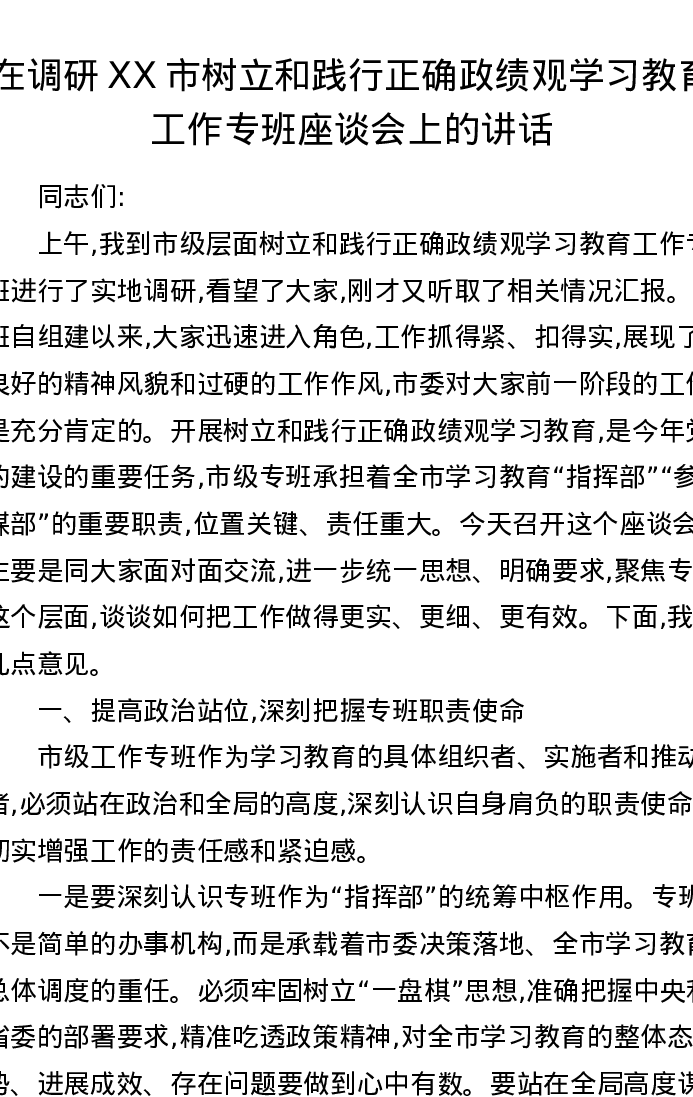 在调研XX市树立和践行正确ZJG学习教育工作专班座谈会上的讲话