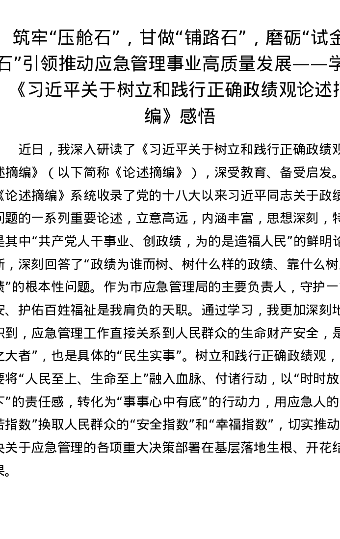 筑牢压舱石,甘做铺路石,磨砺试金石引领推动应急管理事业高质量发展——学习《总书记关于树立和践行正确ZJG论述摘编》感悟