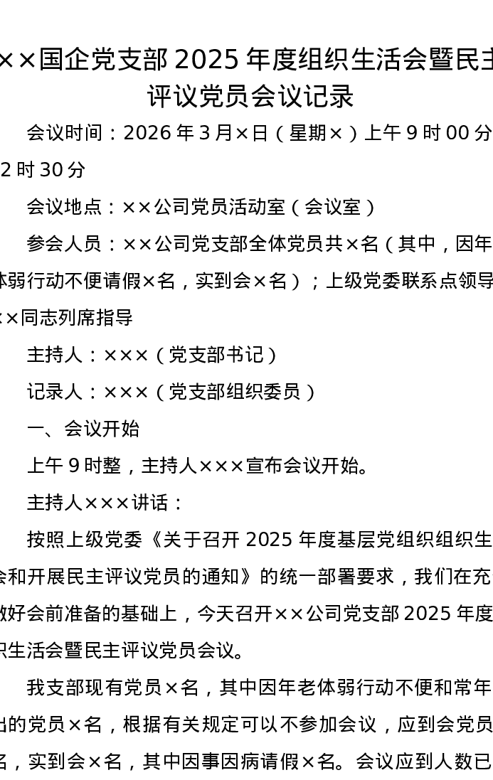 ××国企党支部2025年度组织xxx暨民主评议党员会议记录