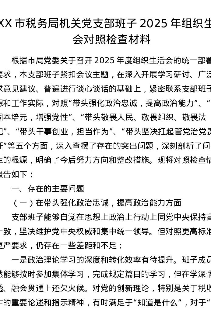 XX市税务局机关党支部班子2025年组织xxx对照检查材料