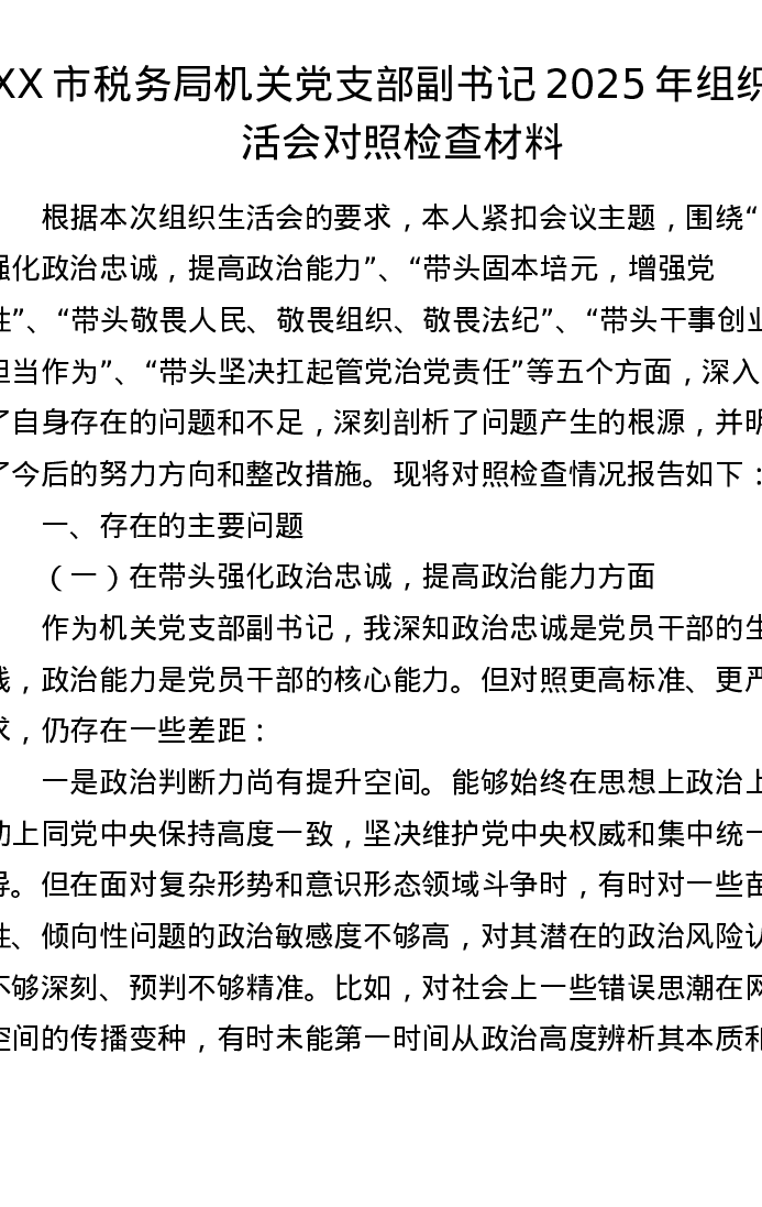 XX市税务局机关党支部副书记2025年组织xxx对照检查材料