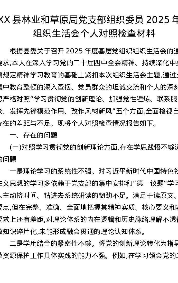 XX县林业和草原局党支部组织委员2025年度组织xxx个人对照检查材料