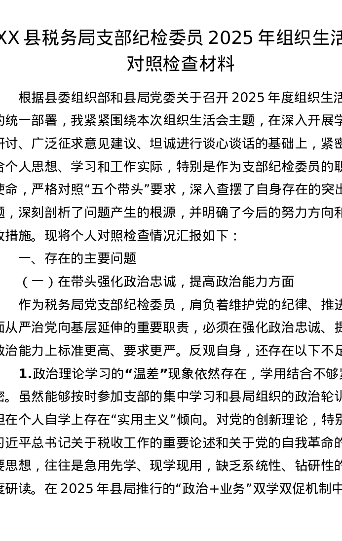 XX县税务局支部纪检委员2025年组织xxx对照检查材料2