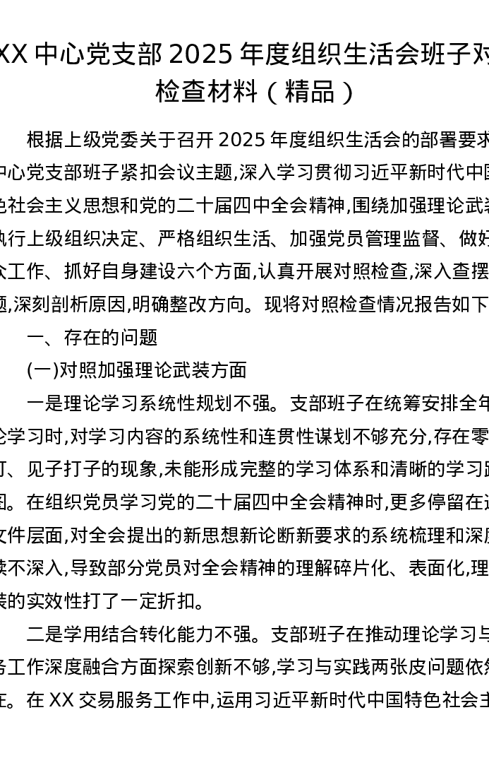 XX中心党支部2025年度组织xxx班子对照检查材料