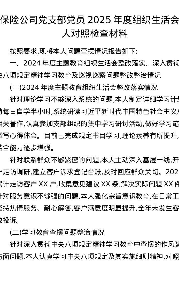 保险公司党支部党员2025年度组织xxx个人对照检查材料